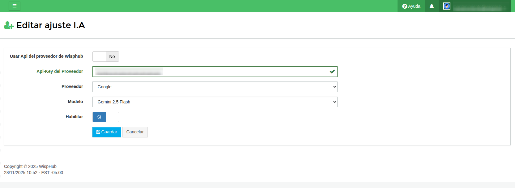 Como mencionamos, puedes decidir WispHub sea el proveedor de Inteligencia Artificial para las actuales y futuras implemantaciones relacionadas a I.A. Para esto, solo basta con mantener activa la casilla de Usar Api del proveedor de Wisphub.