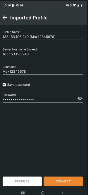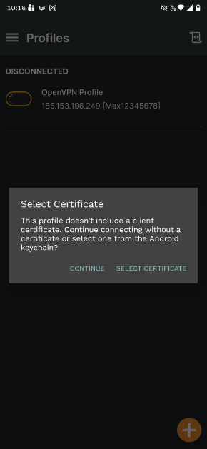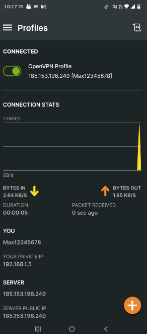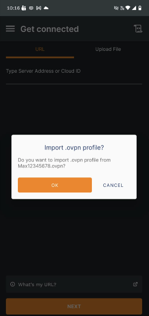 1. Ahora, para conectar la VPN en el telefono, solo tenemos que abrir el archivo y darle clic al botón naranja.