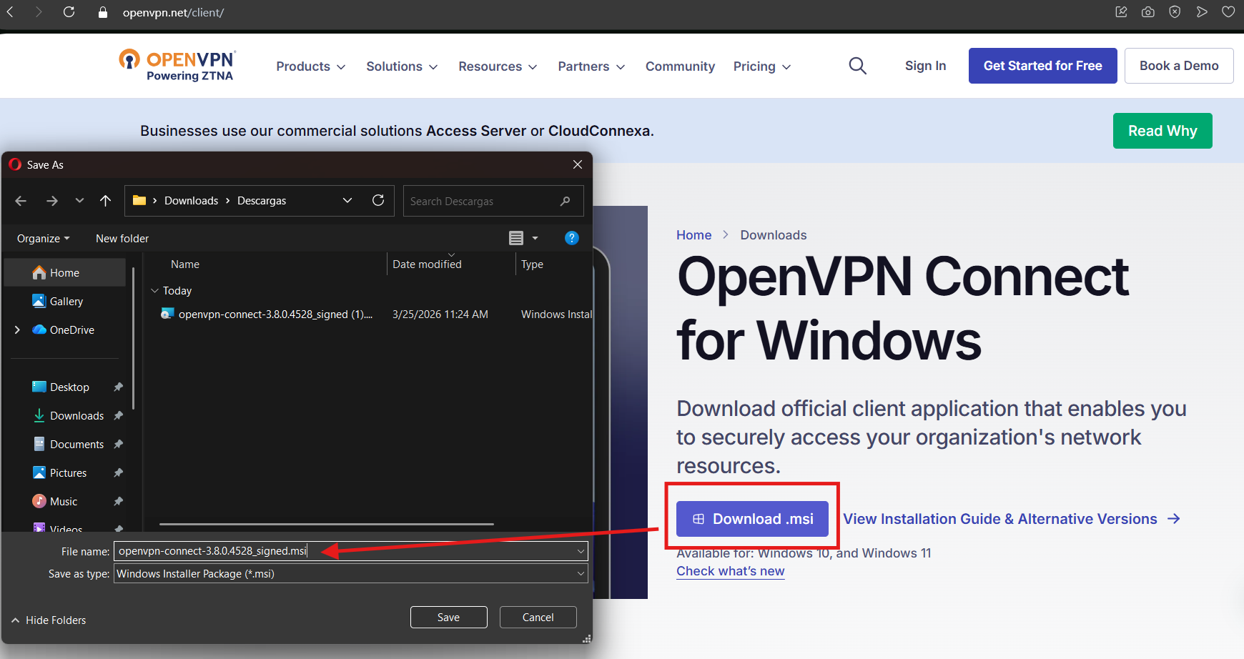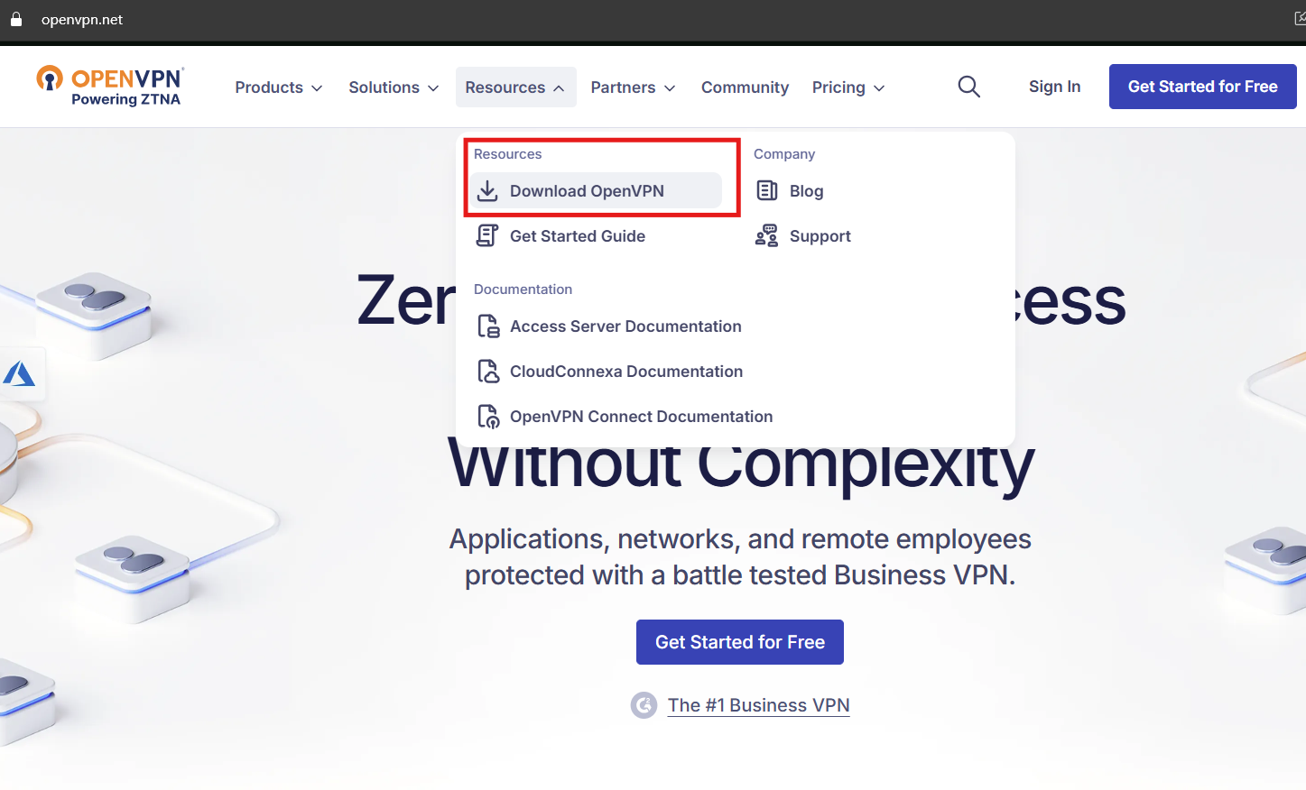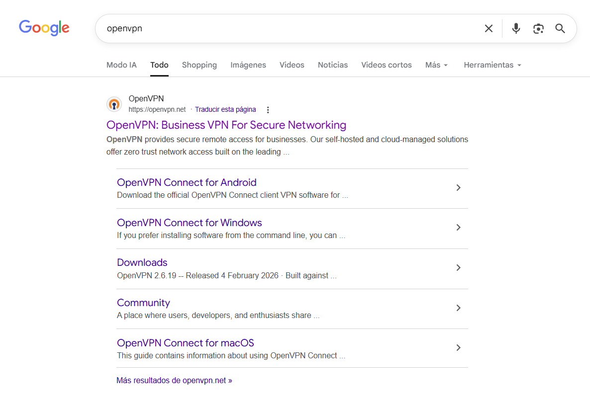 1. Primero, debemos descargar la aplicación OpenVPN desde su sitio oficial, por lo que debemos acceder a su portal en la web: