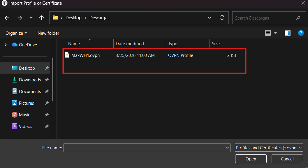6. Despued de haberle dado clic en "Upload file del paso anterior, Necesitamos agregar el archivo .OVPN proporcionado por el equipo de soporte técnico a través del chat en linea.