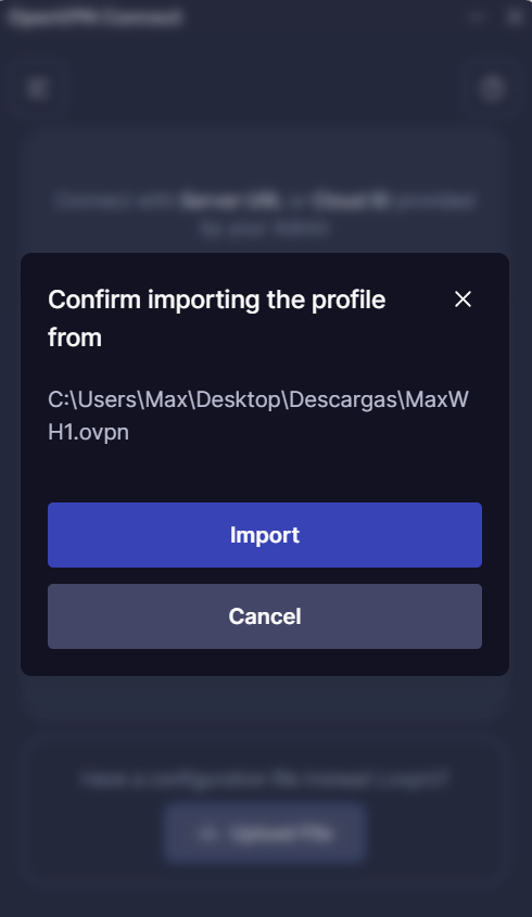 8. Una vez seleccionado el archivo, nos aparecerá una ventana similar a la que se muestra en la imagen, debemos dar clic en el botón de "Import" para agregar este mismo archivo a la aplicación OpenVPN.