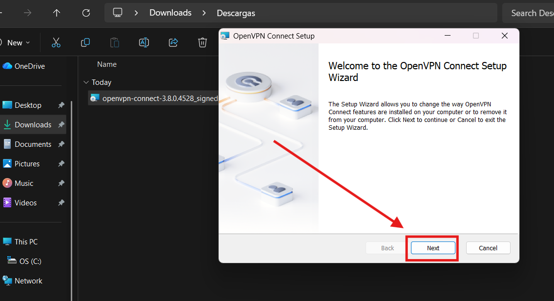 4. Ya que tengamos el archivo guardado en nuestro PC, debemos instalar la aplicación OpenVPN y aceptar los terminos y condiciones de la aplicación.