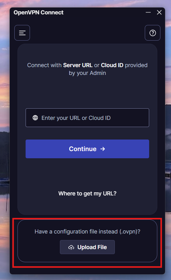5. Ya que tengamos instalado OpenVPN, debemos abrir la aplicación y nos aparecerá la pantalla de inicio, debemos darle clic en donde dice: "Upload File".