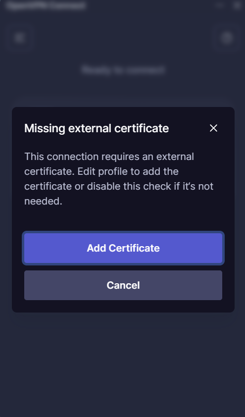 11. Una vez hayamos ingresado nuestras credenciales, nos saldrá una ventana como la que se muestra en la imagen, debemos dar clic en: "Add certificate".