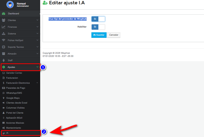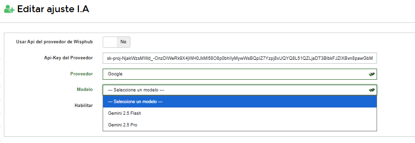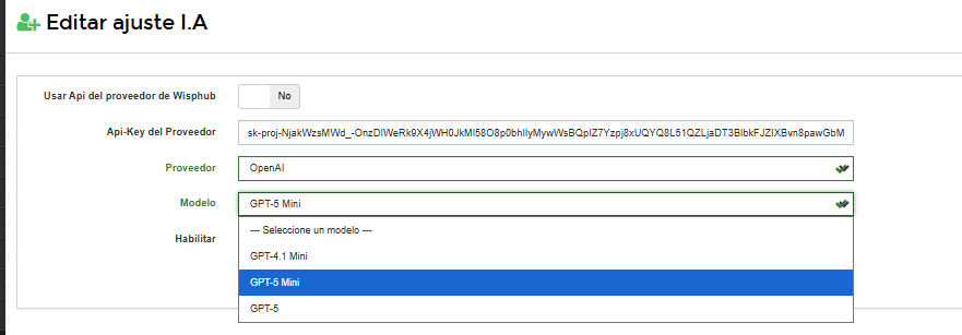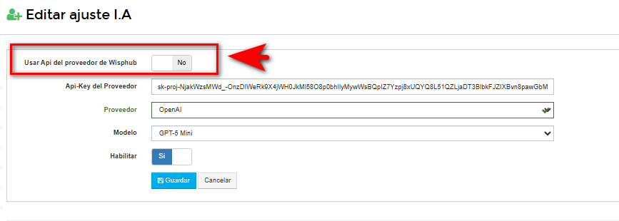 Usar Api del proveedor de Wisphub o en caso de ya contar con un Api-Key de provedor se podria hacer uso con su motor de IA, este apartado puede configurarlo desde AJUSTES > IA
