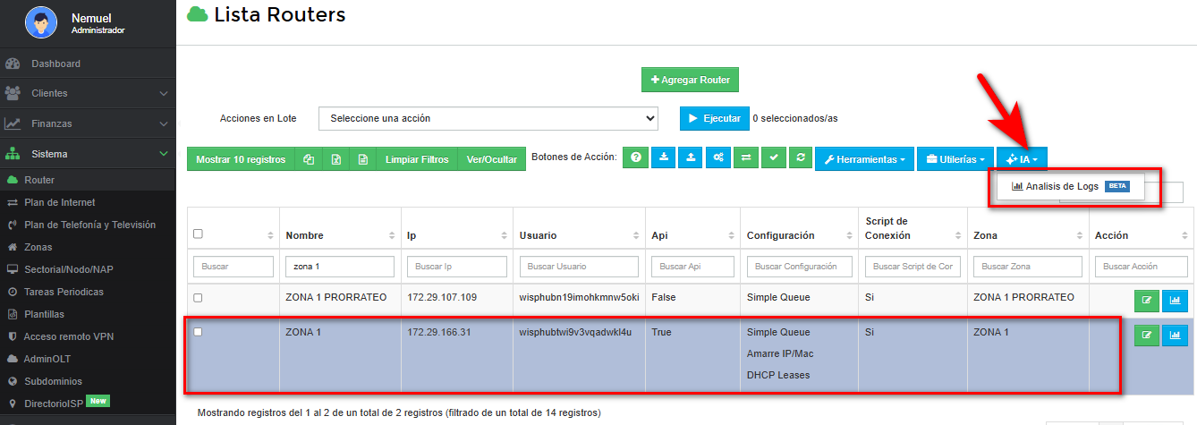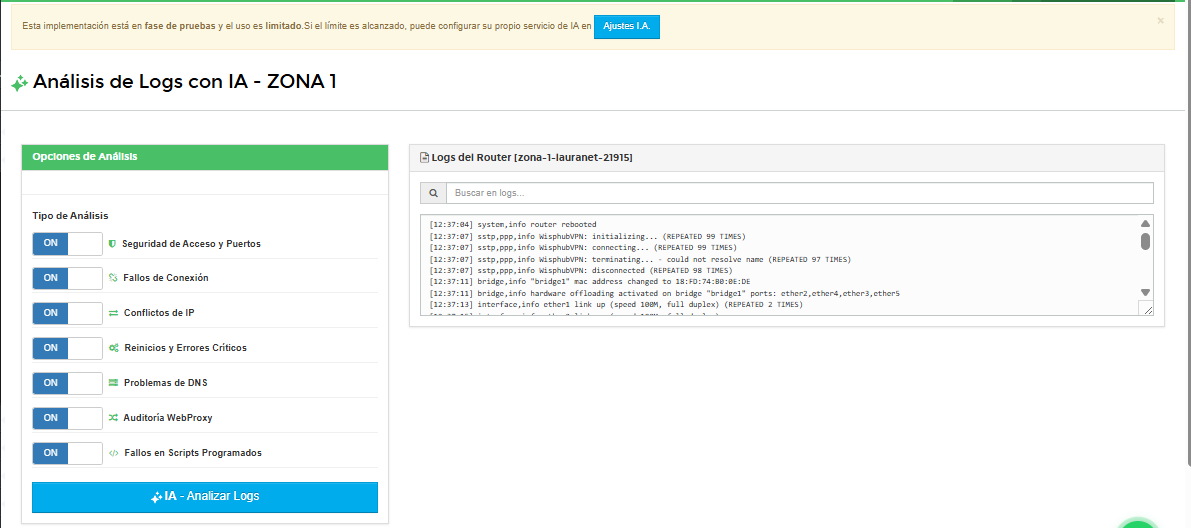 Ahora en WispHub es posible hacer que la Inteligencia Artificial análice los logs y configuración de su MikroTik para detectar problemas con Accesos y Puertos, Conflictos de IP, Problemas de DNS, entre otros.