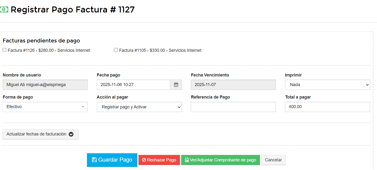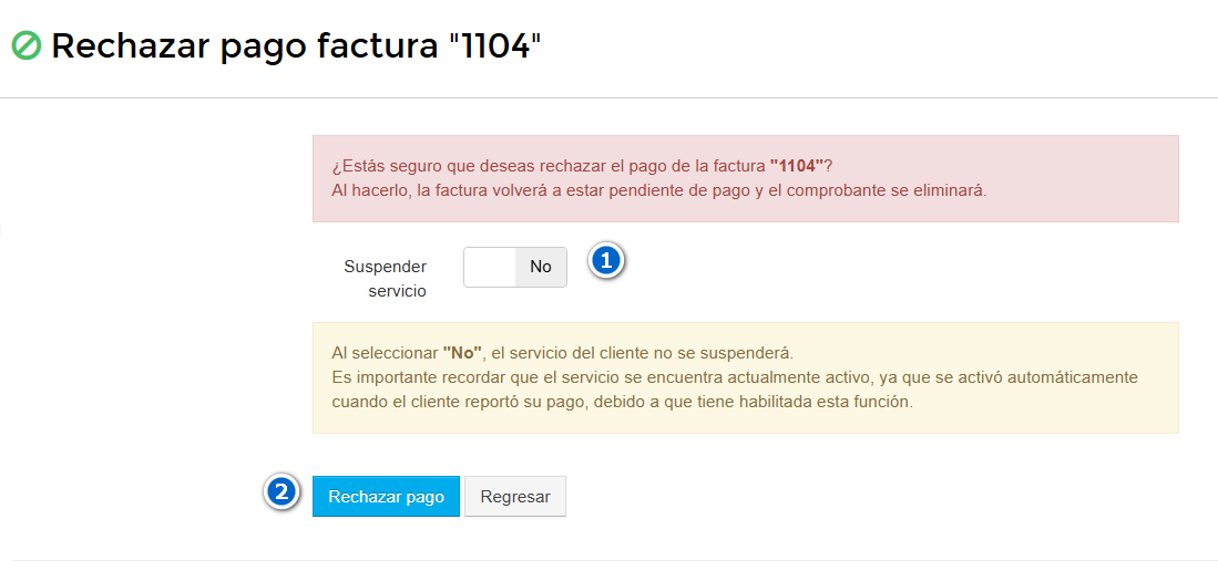 Si el pago es incorrecto puedes rechazarlo desde el boton rechazar y si el cliente se encuentra activo podrás suspender el servicio también.