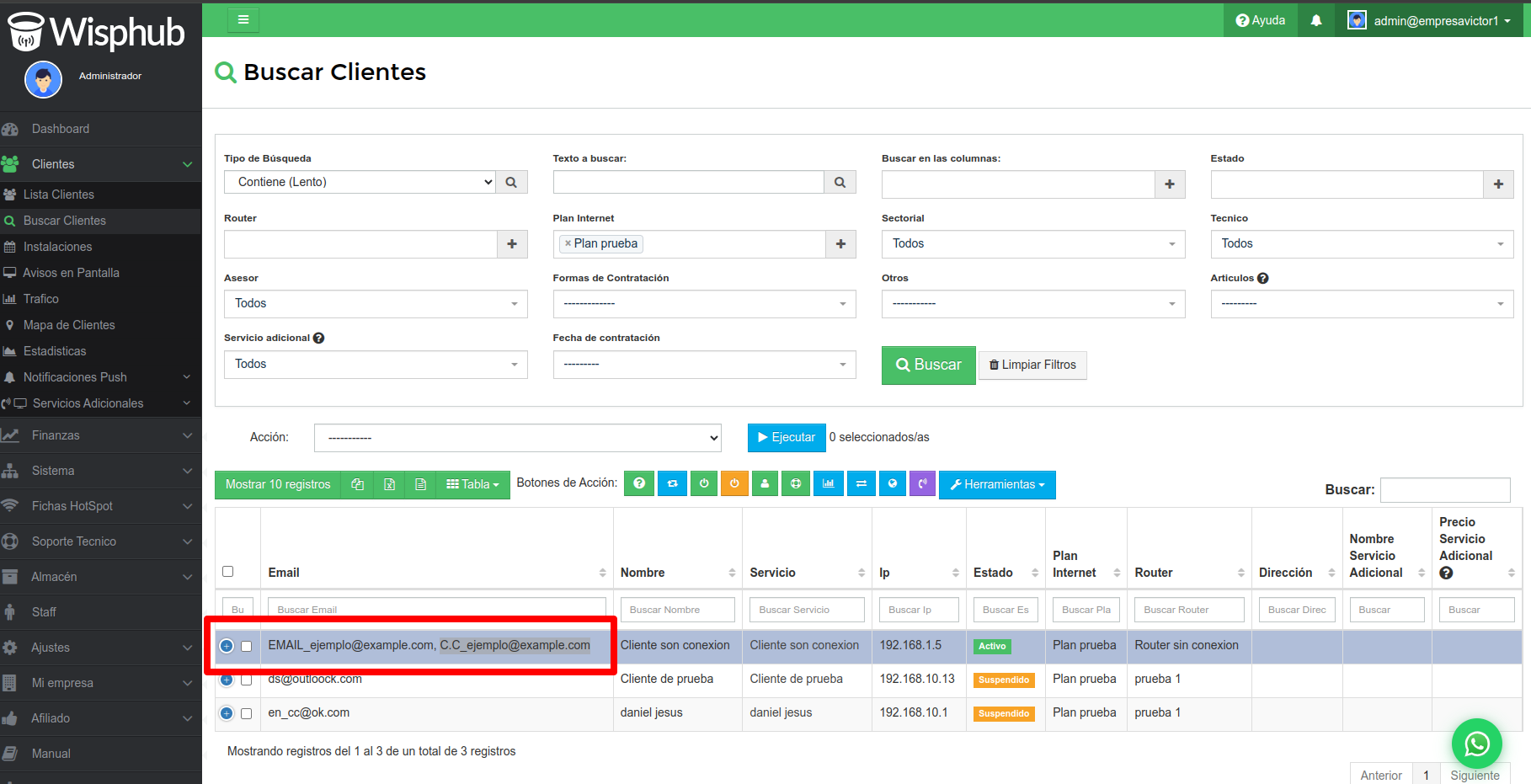 El corte de servicio aplica tanto en las funciones de corte automático por zona y por usuario, como también de forma masiva desde la lista de clientes, mediante la acción “Desactivar clientes seleccionados”.