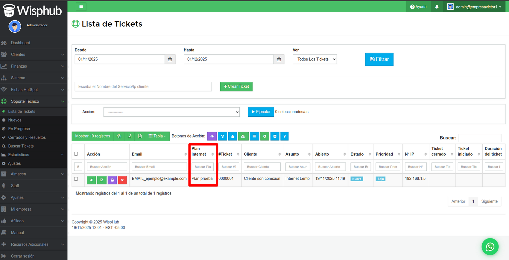 Se añadió la columna Plan de Internet en la lista de tickets. Esta columna es configurable desde la vista de Mostrar Columnas. -
